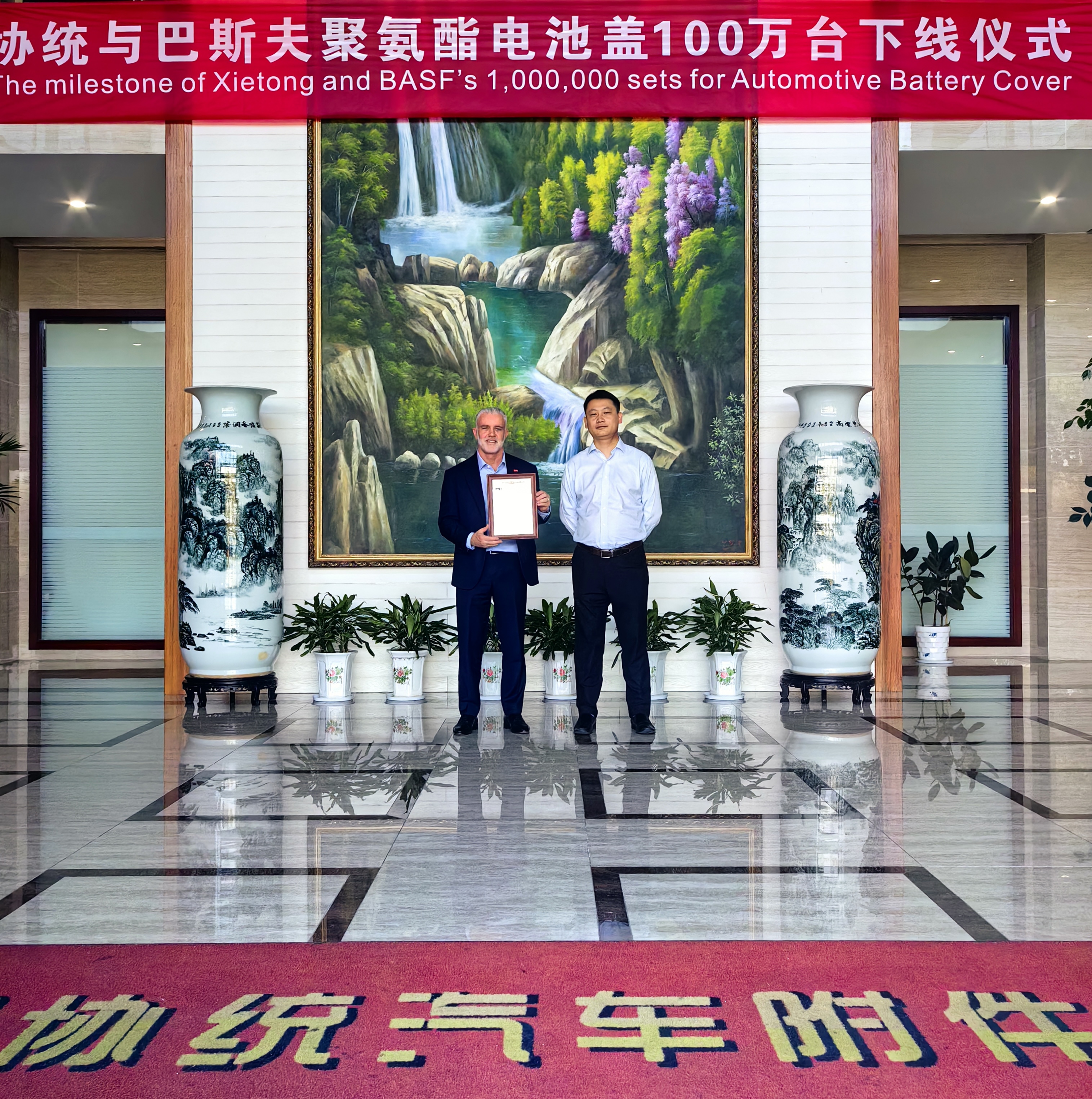 巴斯夫高級副總裁說:“很高興與江陰協(xié)統(tǒng)一起慶祝我們100萬套汽車電池蓋下線里程碑!我們非常榮幸能與協(xié)統(tǒng)合作生產(chǎn)聚氨酯STM復合材料電池蓋。巴斯夫與協(xié)統(tǒng)首創(chuàng)的STM工藝電池盒蓋不僅耐用、機械性能高,而且還能實現(xiàn)車輛輕量化,從而提高能源效率并減少二氧化碳排放。感謝協(xié)統(tǒng)將我們評為核心供應商。我們期待與江陰協(xié)統(tǒng)更多更深入的創(chuàng)新與合作!”